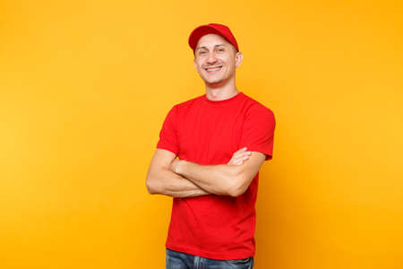 Delivery man in red uniform isolated on yellow orange background. Professional smiling confident male employee in cap, t-shirt courier dealer holding hands crossed folded. Service concept. Copy space