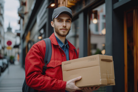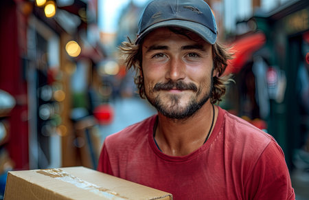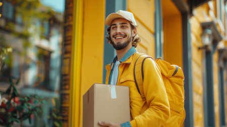 A jovial delivery man energetically carries parcels along a bustling city street, bringing a personal touch to package delivery.