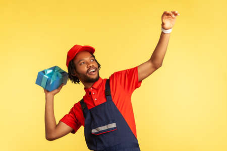 Portrait of smiling happy male courier wearing professional blue uniform and red cap throwing presents box, fast delivery service. Indoor studio shot isolated on yellow background.