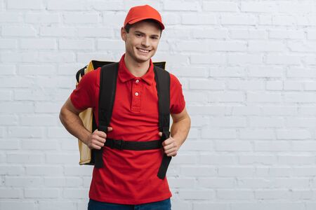 Delivery man in red uniform carrying thermo backpack and smiling at camera near brick wall