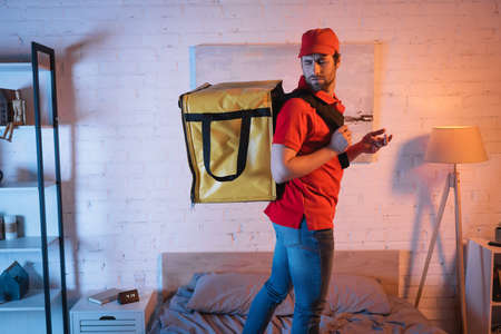 Confused sleepwalker in uniform with delivery thermo backpack standing on bed