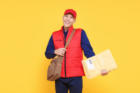 Happy postman with bag and envelopes on yellow background