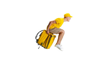 Young delivery man in yellow uniform flying to deliver order isolated on white background. Concept of convenience, speed, comfort, safety, service.