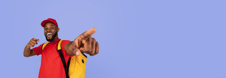 cheerful delivery man carrying yellow backpack and smiling on blue, banner
