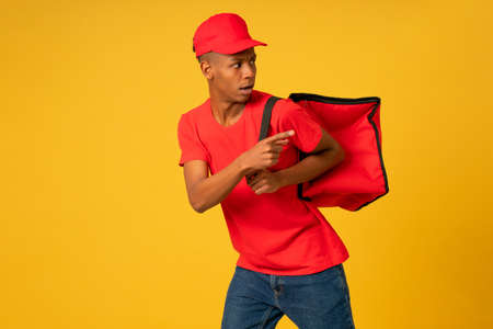 Portrait of a young courier, delivery man in red uniform with a thermal backpack isolated on a red background. Fast home delivery. Online order. Courier delivers groceries home.