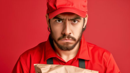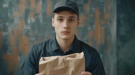 young courier looking at camera in uniform holding a paper food package generative ai