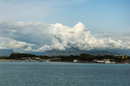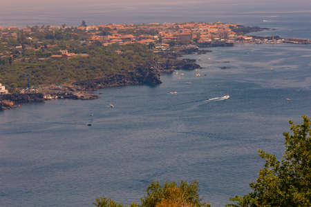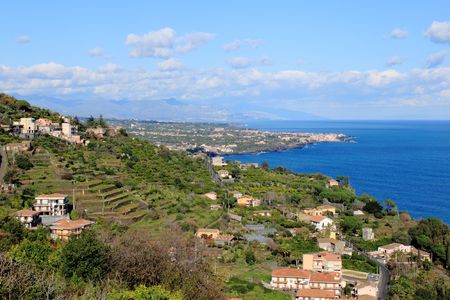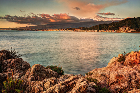 Landscape of the splendid Sicilian coast, on the background Etns volcano