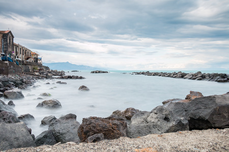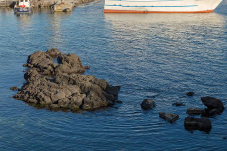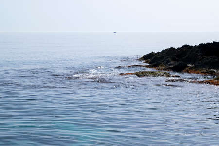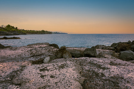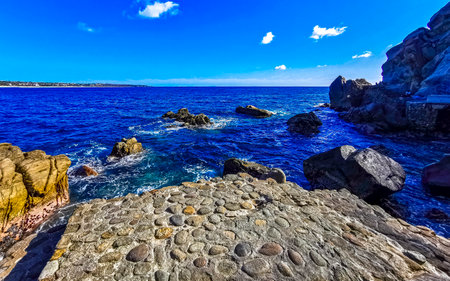 Bright blue sea and volcanic rocks on the coast near etna and catania in italy