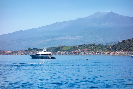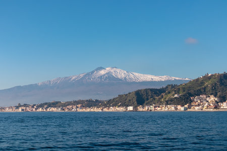 Giardini-Naxos touristic resort with beautiful Etna volcano covered with snow on Sicili, Italy