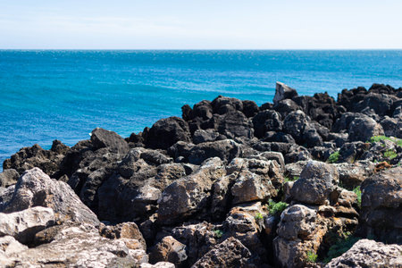 Cascais, Portugal - May 22, 2025: Rocky coastline with clear blue ocean waves crashing against the shore, showcasing natural beauty and rugged landscape in a serene environment