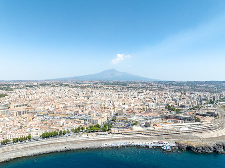 Beautiful aerial view of the Catania city near the main Cathedral and Etna volcano on the background. Amazing old town view from above.