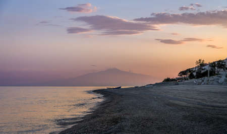 Mount Etna and the Giardini Naxos coastline at dawn. View from Taormina, Sicily, Italy.