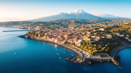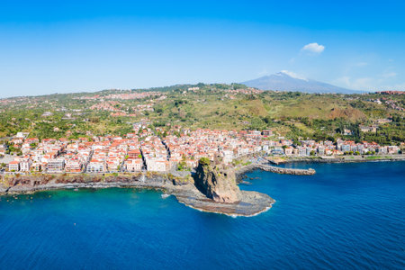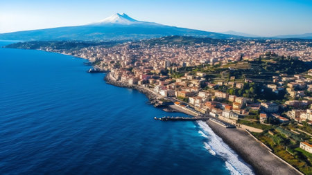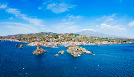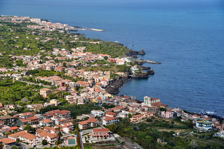 Generative AI : Aerial view of Santa Maria La Scala along the coastline in Acireale Catania province Sicily Italy