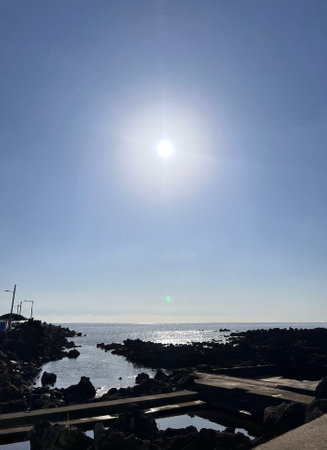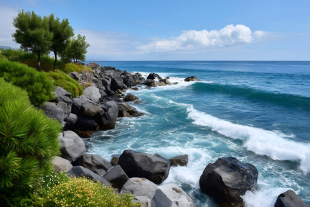 Ocean waves washing against a rugged volcanic rock coast under a clear summer sky