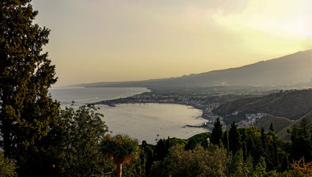 panoramic view across Taormina and Giardini Naxos towards Mount Etna at sunset