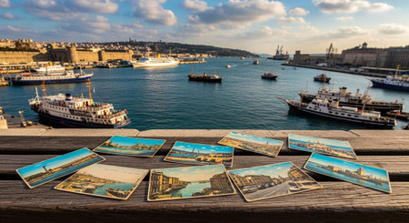 picturesque sunrise or sunset in a sea port with a gulf dock pier with tour boats and a town with cloudy sky on background of a seashore landscape