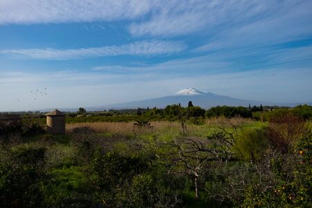 rural landscape and snowy volcano Etna smoking, Sicily
