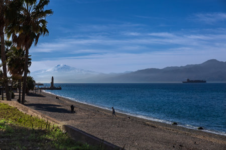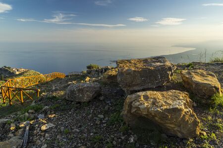 landscape illuminated by morning sun near Reggio di Calabria with island of Sicily and Mount Etna, Italy