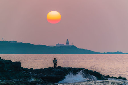 A lone photographer with a tripod captures the serene sunset over the Shimen coastline in New Taipei City, Taiwan, with the iconic Fuguijiao Lighthouse in the distance.