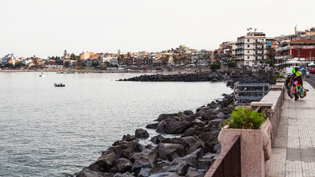 GIARDINI NAXOS, ITALY - JUNE 28, 2017: people on waterfront in Giardini-Naxos town in summer evening. Giardini Naxos is seaside resort on Ionian Sea coast since the 1970s