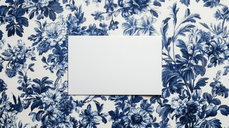 White card mockup invitation on tender toile de jouy vintage floral pattern in blue and white, top view. Generative AI.