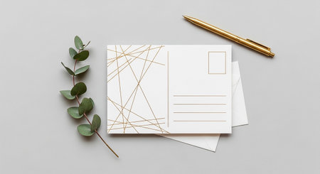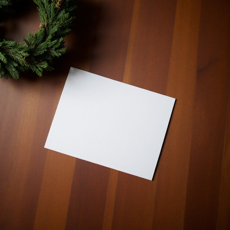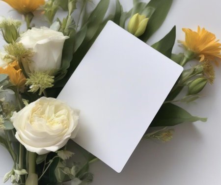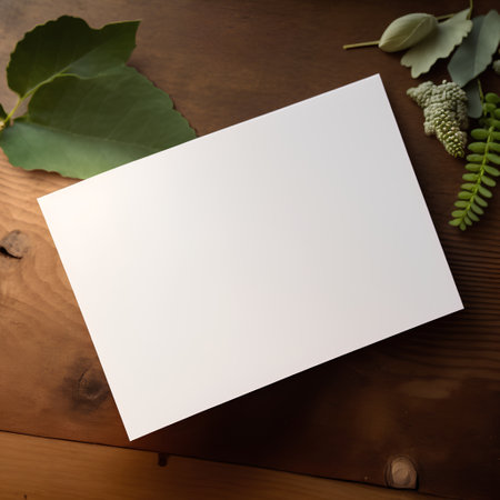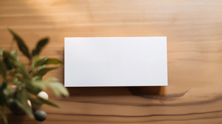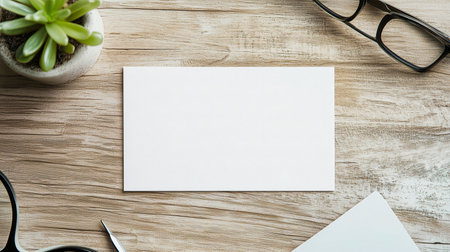 A blank card sits on a table next to glasses and a plant, created with Generative AI