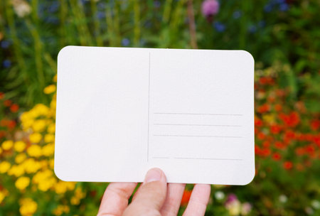Hand of woman holds the empty white paper postcard against green leaves and flowers natural background