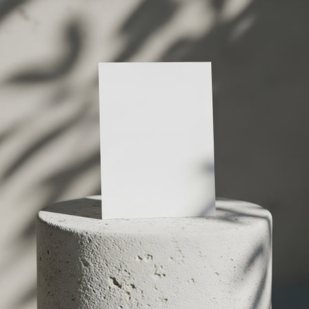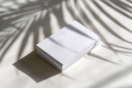 A crisp, white textured card is presented on a neutral-toned surface. The card is positioned at an angle, creating a subtle shadow. Overlaying the scene is the distinct shadow of palm leaves, casting intricate patterns of light and dark across the card and the surface. This creates a visually appealing contrast and a sense of natural elegance. The composition is clean and minimalist, offering ample copy space for text or making it mockups or presentations.