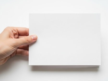 A close-up image showcasing a hand holding a blank white business card, perfect for branding or marketing purposes with a soft greenery background.