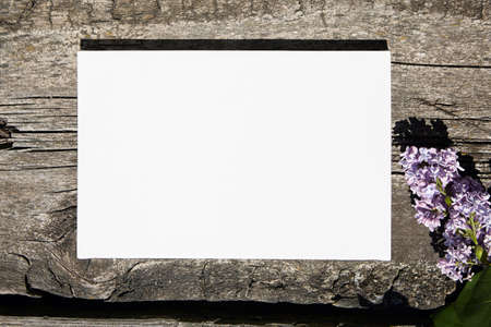 Mock up of a blank sheet on a light wood background with woolen cloth. Paper template for design. business card. Flat lay, copy space.