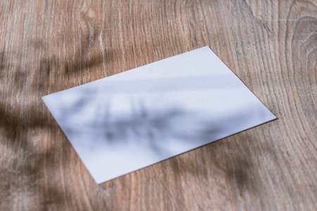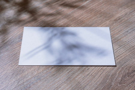 Minimalistic white mockup of a blank postcard lying on a wooden surface with soft natural shadows from plants. Template for branding, stationary design, wedding invitations and greeting cards