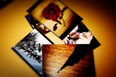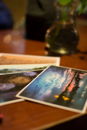 Collection of photos on a table, close-up, selective focus