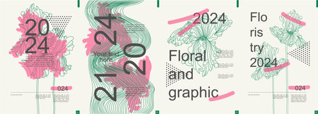 Floral modern banner with trendy minimalist typography design. Poster templates with blooming iris graphic silhouettes, abstract geometric line grids with waves, text elements. Vector illustration.
