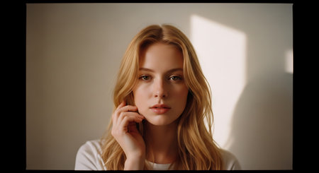A young woman with long blonde hair and a contemplative look, gently touching her face against a plain background with soft lighting and shadows.