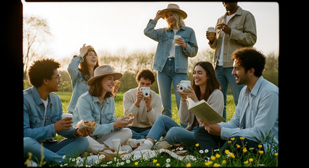 A group of friends are gathered outdoors, smiling and chatting while one person takes a photo and another enjoys a cup of coffee on a sunny day.