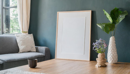 Modern scandinavian interior living room with mock up poster frame, coffee cup, plant, and sea view.