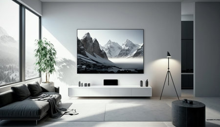 An eye catching illustration of Smart TV on the white wall in living room, minimal design. Created using Generative AI tools.