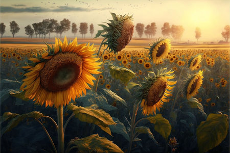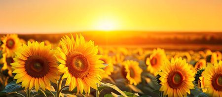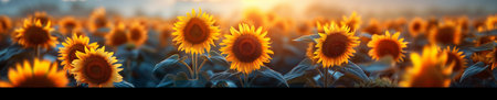 Beautiful digital pnting of a wide sunflower field illuminated by golden sunset rays, creating a serene and vibrant landscape. raster illustration. Wide panoramic banner image