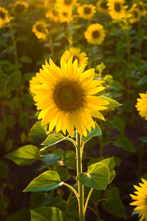 Sunflower field at sunset. Sunflower blooming in the summer.