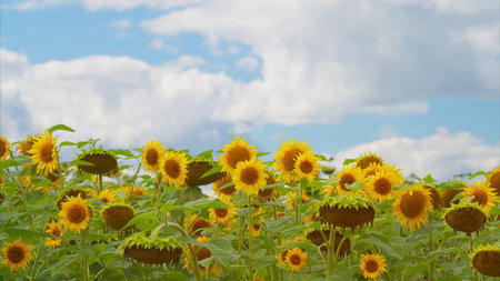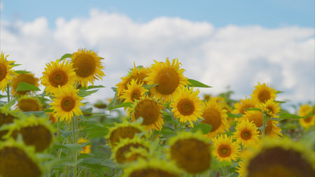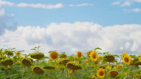 Sunflower field with blue sky and clouds. Sunflower blooming in summer.