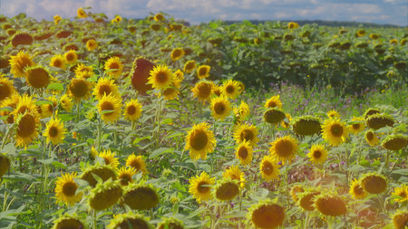Majestic agricultural landscape, farming view with sunflowers field and beautiful sky. Vintage stylization, retro film filter