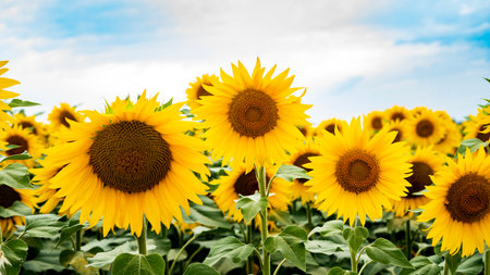 Sunflower field over cloudy blue sky background. Sunflower blooming in summer