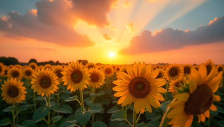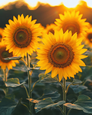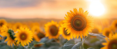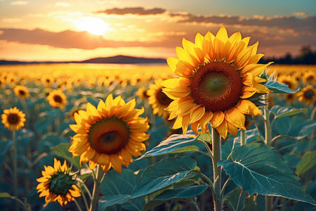 Sunflowers bask in the golden light of a breathtaking sunset. A vibrant summer scene.