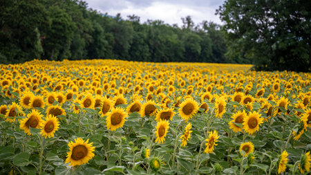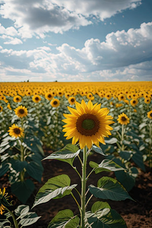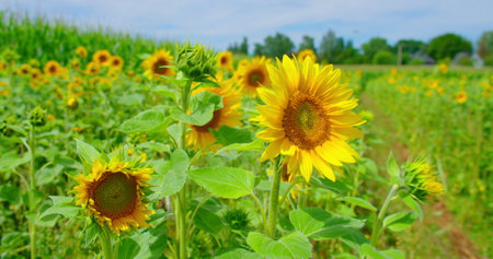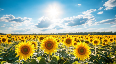 Vibrant field of blooming sunflowers with tall green stems under natural daylight in a rural summer landscape