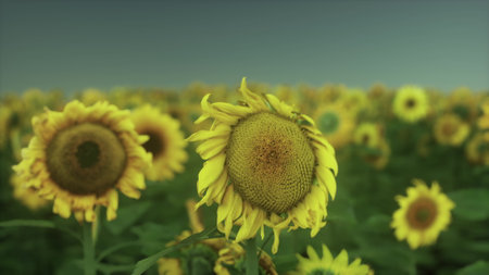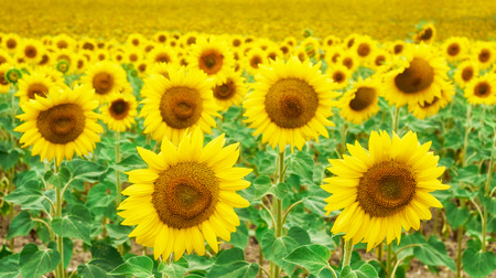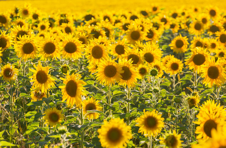 Large field of blooming sunflowers in sunlight. Agronomy, agriculture and botany