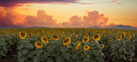 A panorama of a field of blooming sunflowers with distant mountains A panorama of a field of blooming sunflowers with distant mountains at sunset.