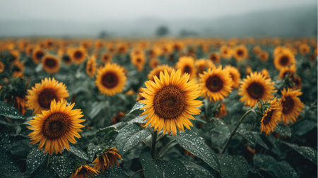 A panoramic wide view of sunflower field growing closely together under light drizzle soft raindrops on leaves ultra realistic photography natural daylight cinematic wide composition lifelike natural scene