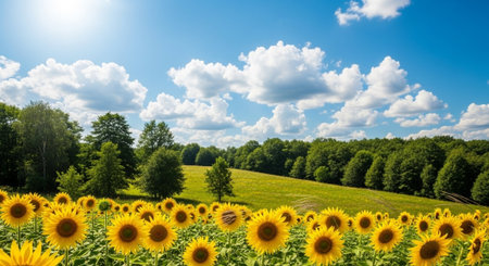 Scenic Sunflower Field Under Blue Sky with Bright Sunlight