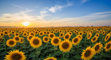 a picturesque sunflower field stretches to the horizon under a clear blue sky at sunset time