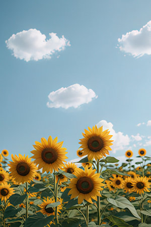 A vibrant field is filled with tall sunflowers swaying gently in the breeze. Bright yellow petals contrast against a clear blue sky. This peaceful scene captures summers beauty.